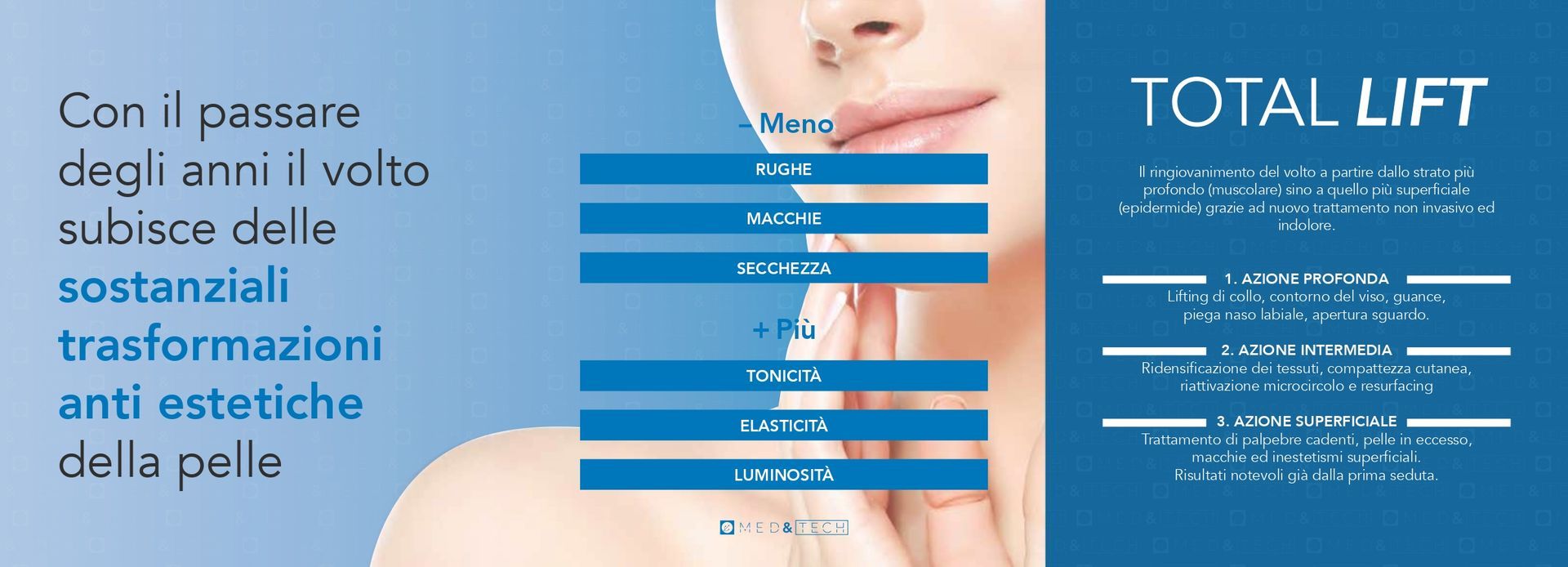 Il Total Lift è un protocollo non invasivo e indolore che agisce su più livelli del tessuto cutaneo.